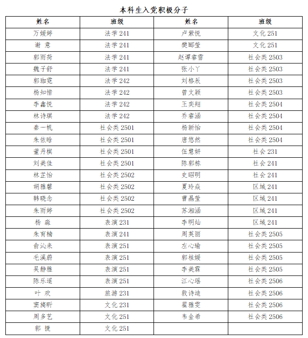 根据《发展党员工作实施细则》有关规定,经各团支部推荐,2026年上半年拟推荐入党积极分子57名,其中本科生拟入党积极分子51名,研究生拟入党积极分子6名。现予以公示: