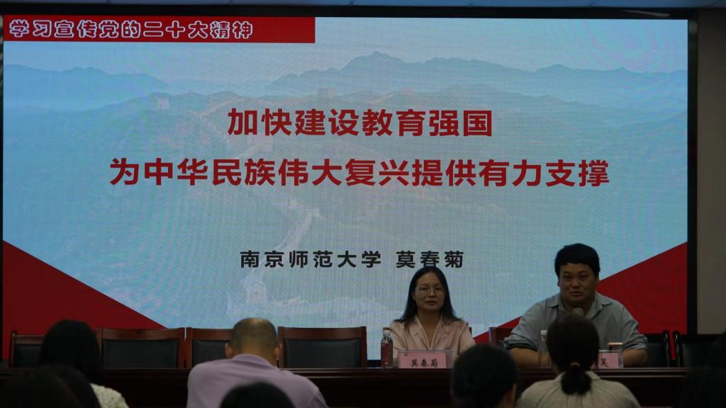 科学技术史系教师党支部、研究生第二党支部、本科第三党支部联合开展主题教育,邀请南京师范大学强化培养学院副书记兼副院长莫春菊副教授,以“加快建设教育强国,为中华民族伟大复兴提供有力支撑”为主题,带领大家学习宣传党的二十大精神。