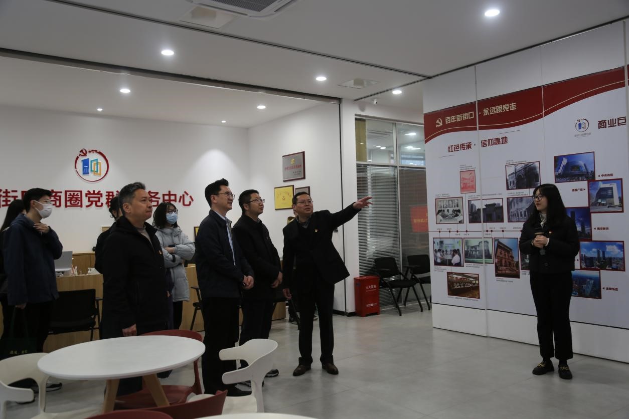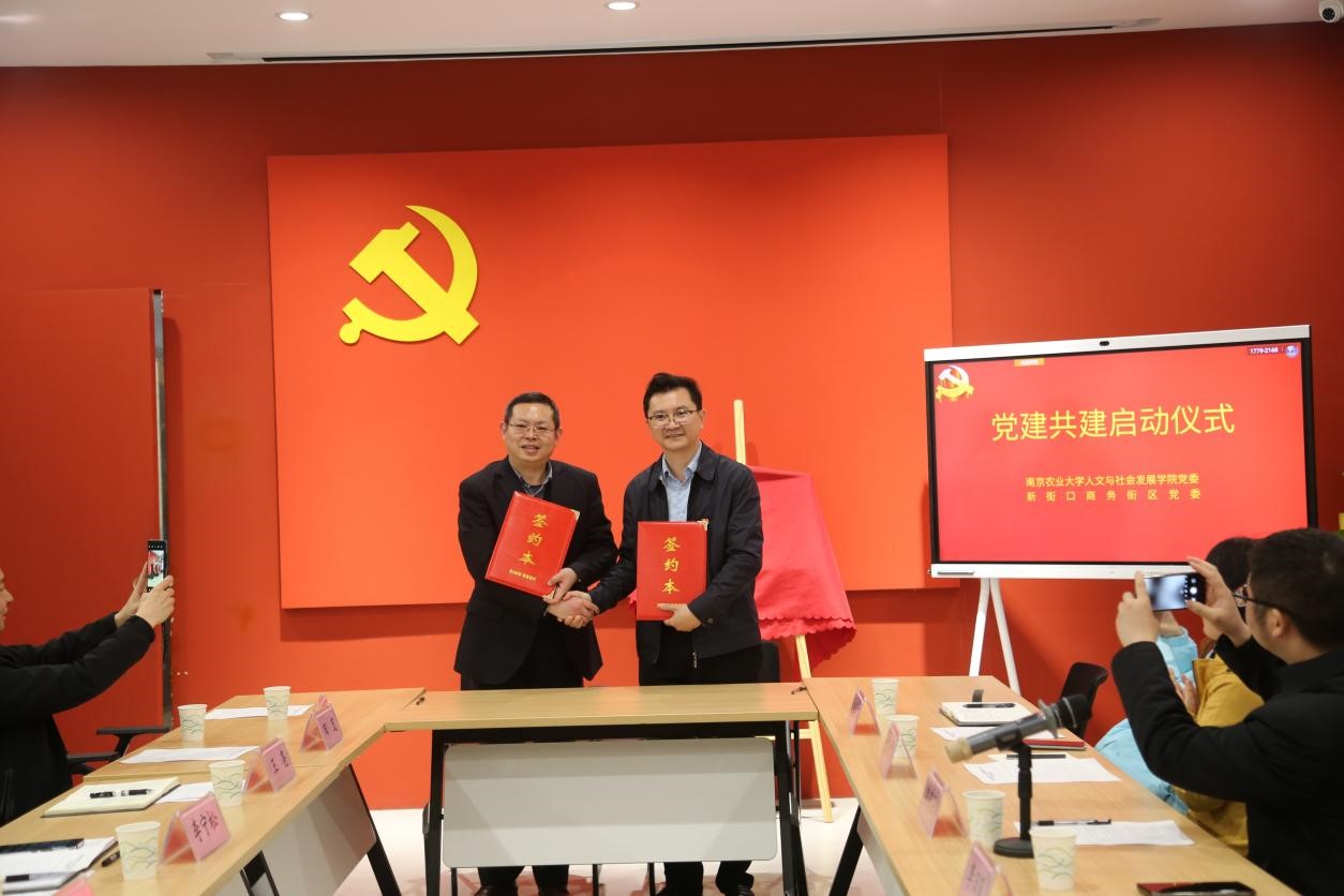 “党建+新街口商圈教育基地”揭牌。戚秋生和李日葵代表双方单位共同签署党建共建协议书。双方商定将在政治理论联学实践活动联办、推进产教融合协同创新发展、弘扬志愿精神聚力服务社会等方面加强交流互动。