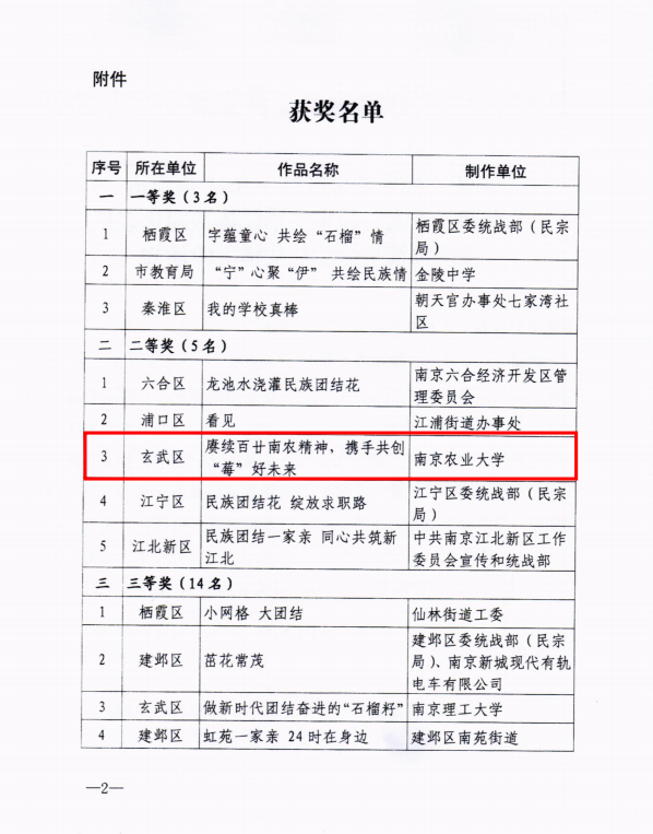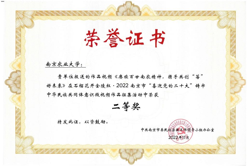 朱琳琳、薛慧两位老师指导、林延胜老师参与,带领学生拍摄的微视频《赓续百廿南农精神,携手共创“莓”好未来》代表我校参加玄武区征选,成为代表玄武区参加南京市决赛的两部入围作品之一。经大赛组委会层层遴选、专家评审和南京市民宗局党组的研究,本视频从16家南京市委民宗工作领导小组成员单位报送的共154部作品中脱颖而出,最终荣获市级二等奖佳绩。