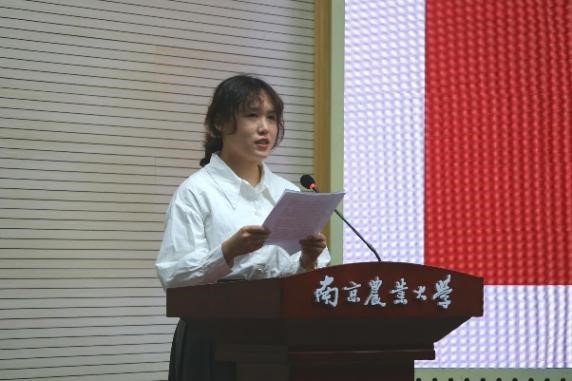新生代表谈云燕用优美的语言表达了自己初入南农,对大学生活的憧憬和期望,她希望在南农四年可以认知自我,学好知识,修炼品德,成为助推党和国家扬帆的涌流。