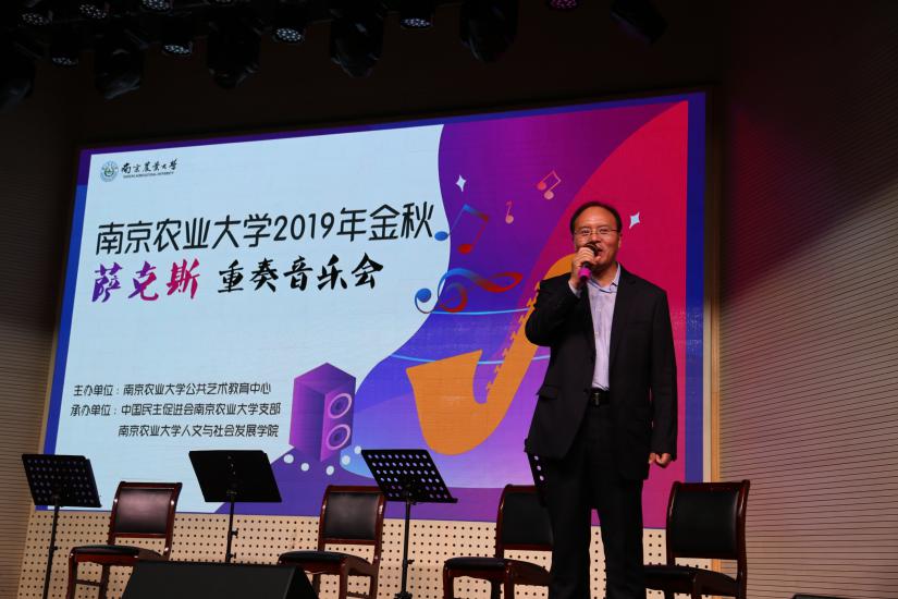 公共艺术中心主任姚兆余教授为大家致辞。姚兆余对本次到场的领导嘉宾表示欢迎,对本次演出的博爱之声萨克斯重奏乐团各位音乐家表示感谢。