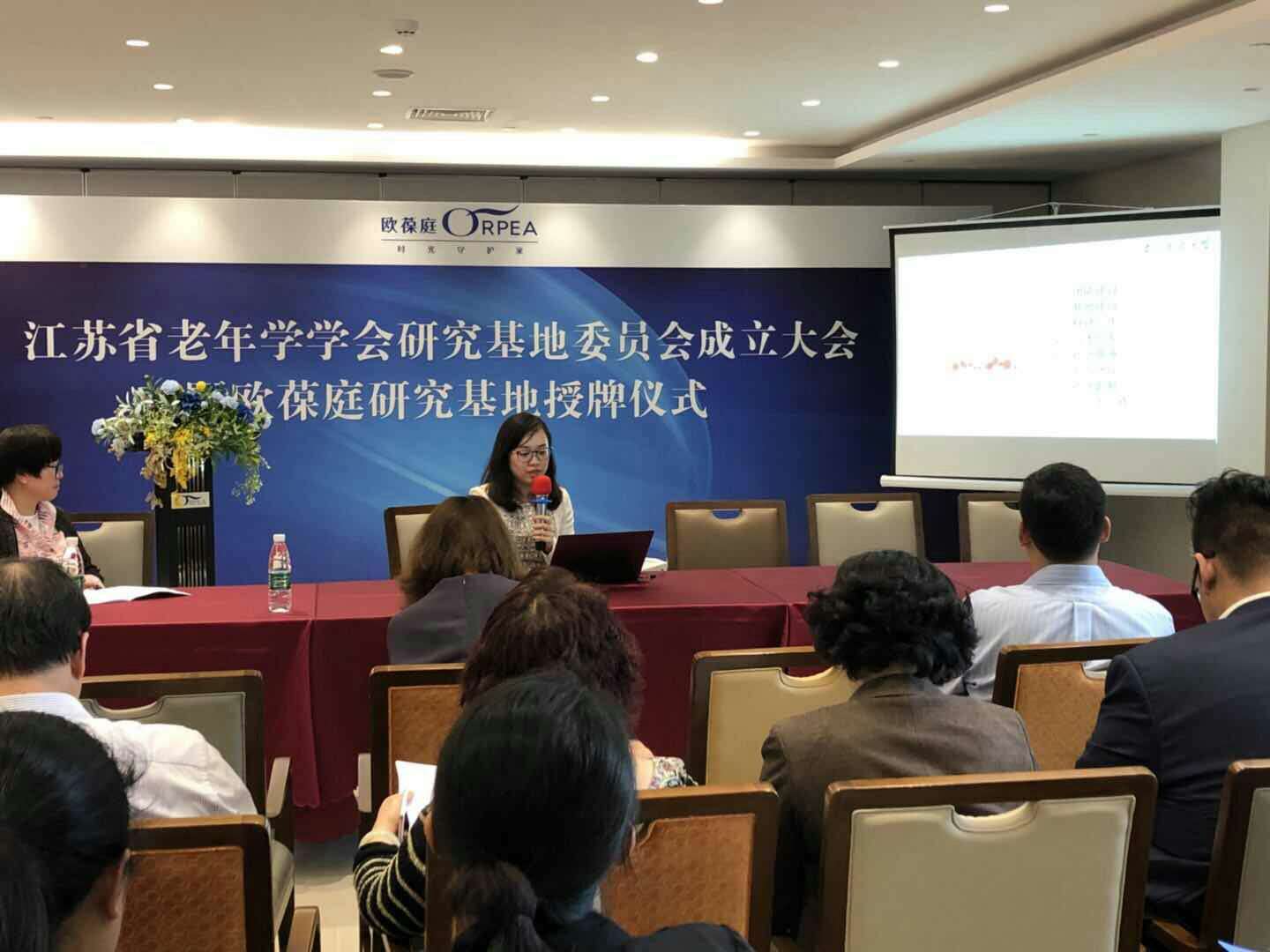 会议伊始,由江苏省老年学学会施会长为江苏欧葆庭老年护理研究基地授牌,欧葆庭法方代表Powlas女士在大会上介绍机构状况。随后,江苏省老年学学会施会长在江苏省老年学学会老年学研究基地委员会成立大会上致辞。在发言中,施会长宣读基地委员会成立批示,依次介绍各个基地委员会领导成员。基地委员会孙中艮主任紧接着对老年学研究基地委员会的工作范围和接下来三年具体工作内容的部署进行报告。最后,由欧葆庭邢姗姗院长带领参会人员参观欧葆庭仙林国际颐养中心。