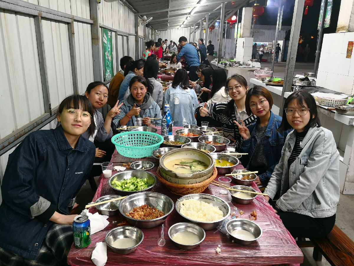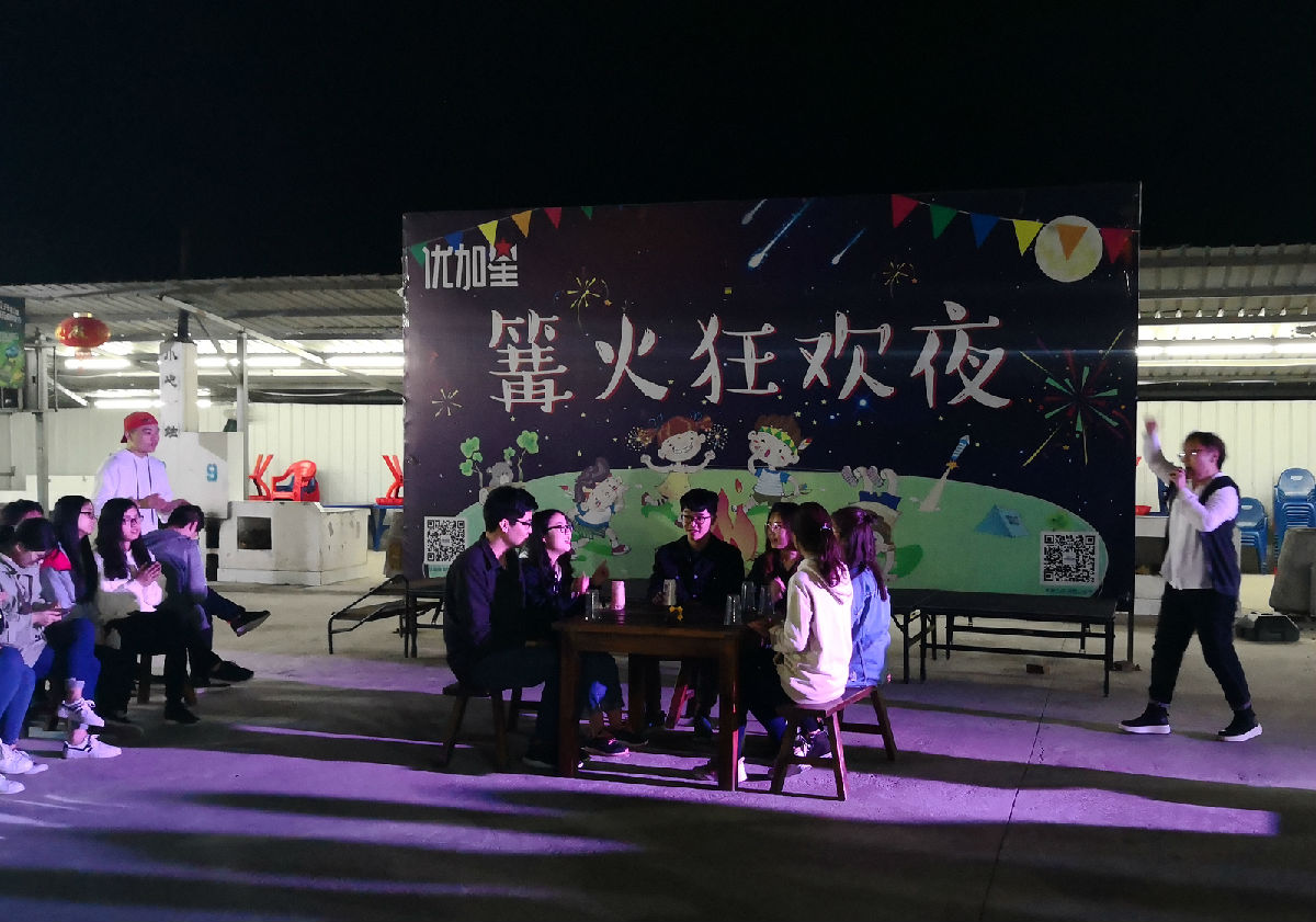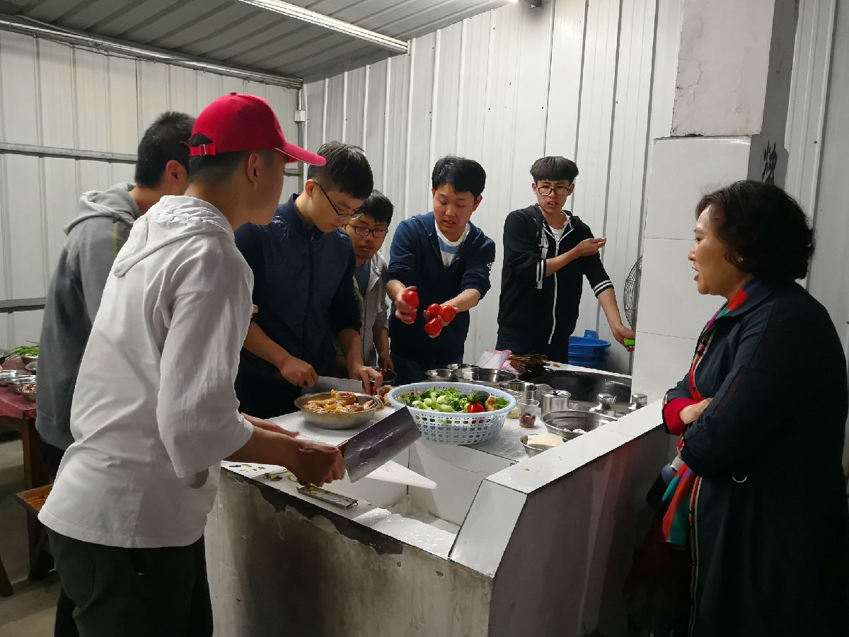 晚上,在张教练的带领下,全体同学来到天淼山庄土灶台区域,开始了精彩的厨神大赛。同学们各显神通,纷纷拿出了自己的“看家本领”,将有限的食材做出了各式菜品,真正领略了一把“农家乐”的感觉。晚上九点,在动感的音乐节奏中、全体师生的欢呼声中,黄颖老师点燃了中心的篝火,随后张教练带领全体师生围着篝火开始了精彩的篝火晚会。随着篝火舞步的跳动、全体师生的喝彩,天空中绽放出朵朵烟火,篝火晚会正式开始。八个小组依次上台展示了小组的才艺,有歌曲大合唱、锅盖舞、英文歌演唱、杯子舞、古典舞、方言祝酒歌等,进一步促进了师生、同学之间的相互了解。