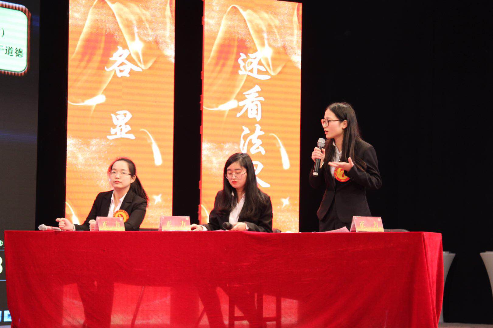最终的辩论环节,6名晋级选手随机抽签,分为两组,分别持正反两方,就主办方现场给出的题目按照辩论赛规则进行比拼。本次辩题为:“精神赡养”属于法律义务还是道德义务,两组选手展开激烈辩论。最终,我校吴露露同学斩获亚军,陈薛妍同学斩获季军。