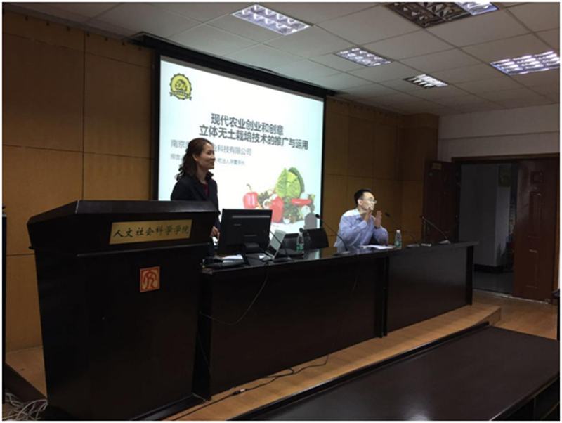 人文院逸夫楼6047举行了一场题为“现代农业创意与创业—立体无土栽培技术的推广与运用”的讲座。黄少敏博士毕业于东京农业大学,现为栖霞区八卦洲农业协会—理事,南京休闲农业协会—常务理事,2015年创办南京鼎态丰农业科技有限公司,主要研究雾培蔬菜高科技技术研发示范与推广。此次讲座由农村发展系余德贵副教授主持。开场前,余德贵副教授对黄少敏博士进行介绍并对她的到来表示欢迎。