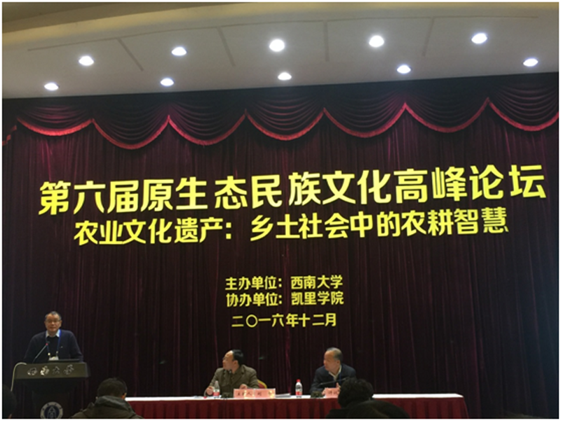 由西南大学、凯里学院共同主办,中国人类民族学院研究会经济人类学专业委员会、西南大学城乡统筹发展与规划研究中心承办的第六届原生态民族文化高峰论坛于2016年12月8-11日在西南大学北碚校区举行。会议主题:“农业文化遗产——乡土社会中的农耕智慧”。