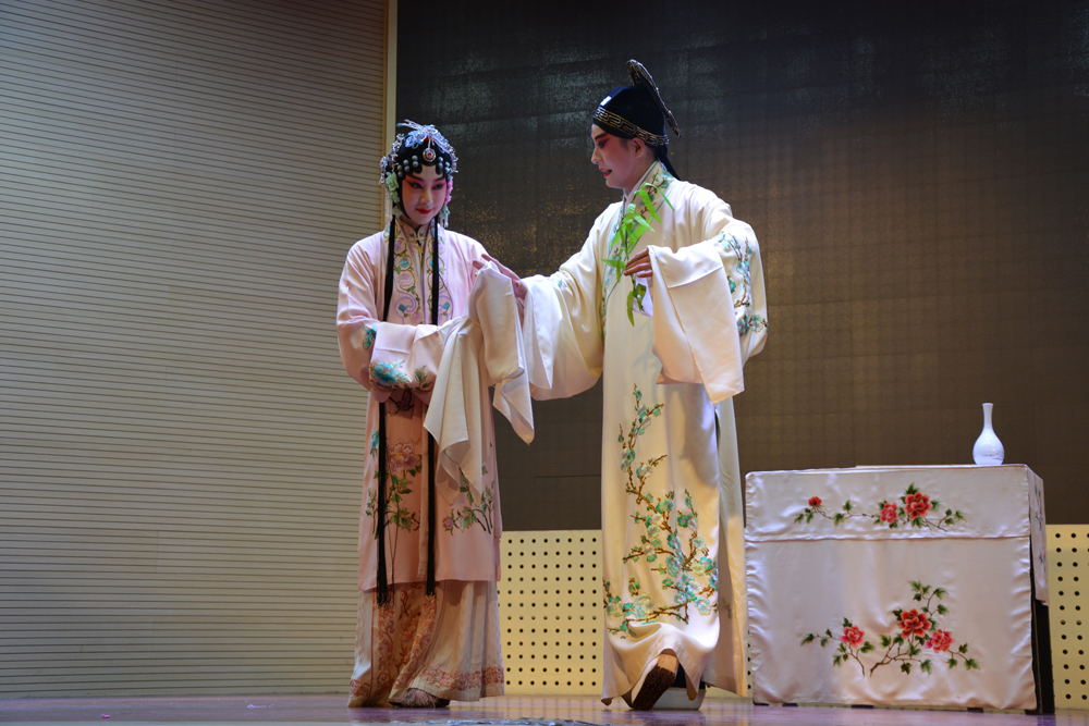 古琴渐响,箫声缓应,在春香与杜丽娘的低吟浅唱中拉开了整场演出的序幕。《牡丹亭•惊梦》一剧情节离奇跌宕、曲折多变,幻想色彩浓厚。著名国家二级演员、全国昆曲青年演员“十佳新秀奖”的获得者单雯、施夏明分别饰演了杜丽娘、柳梦梅。两位青年演员身段、唱腔俱佳,精湛的演技博得了观众们阵阵热烈的掌声。