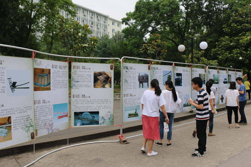 文化管理系教工党支部发起,文化管理系联合江苏省农业遗产协会主办,公管131班承办的“农业文化遗产系列展之2016江苏农具展”在玉兰路如期举行。此次活动的主题是“繁荣文化遗产,领略农具魅力”,旨在宣传传统农具文化遗产,提升广大师生对江苏农业文化遗产的认识与了解。