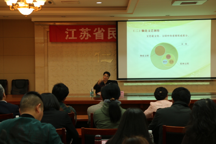 4月20日下午三点半,培训工作在我校金陵研究院二楼会议室举行开班仪式,江苏省文联主席、党组书记章剑华出席了开班仪式,并为学员上了第一课。章主席指出,文化建设必须从两个方面着手,第一方面,是传承,对包括传统文化、传统精神等老祖宗留下来的宝贵财富的保护与继承;第二方面则是创新,创造、构建属于当前这个时代的新文化、新内容。