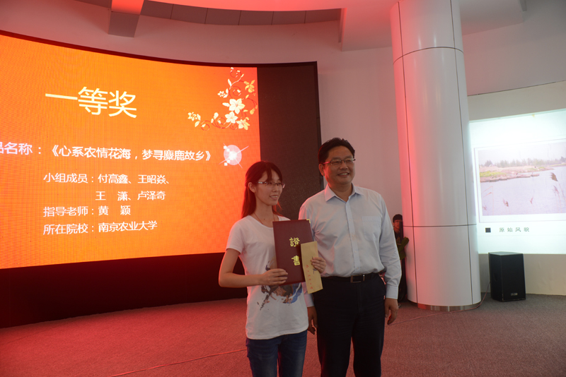 旅游管理系主任刘庆友宣读了本次江苏省“金沙湖”杯大学生旅游路线规划大赛获奖作品、优秀指导教师和优秀组织单位名单,出席颁奖典礼的各位领导向获奖参赛队伍、指导老师和组织单位颁发了荣誉证书及奖金;最后,阜宁县、盐城市、南农大等三位领导就大赛及其可持续性工作上台讲话。