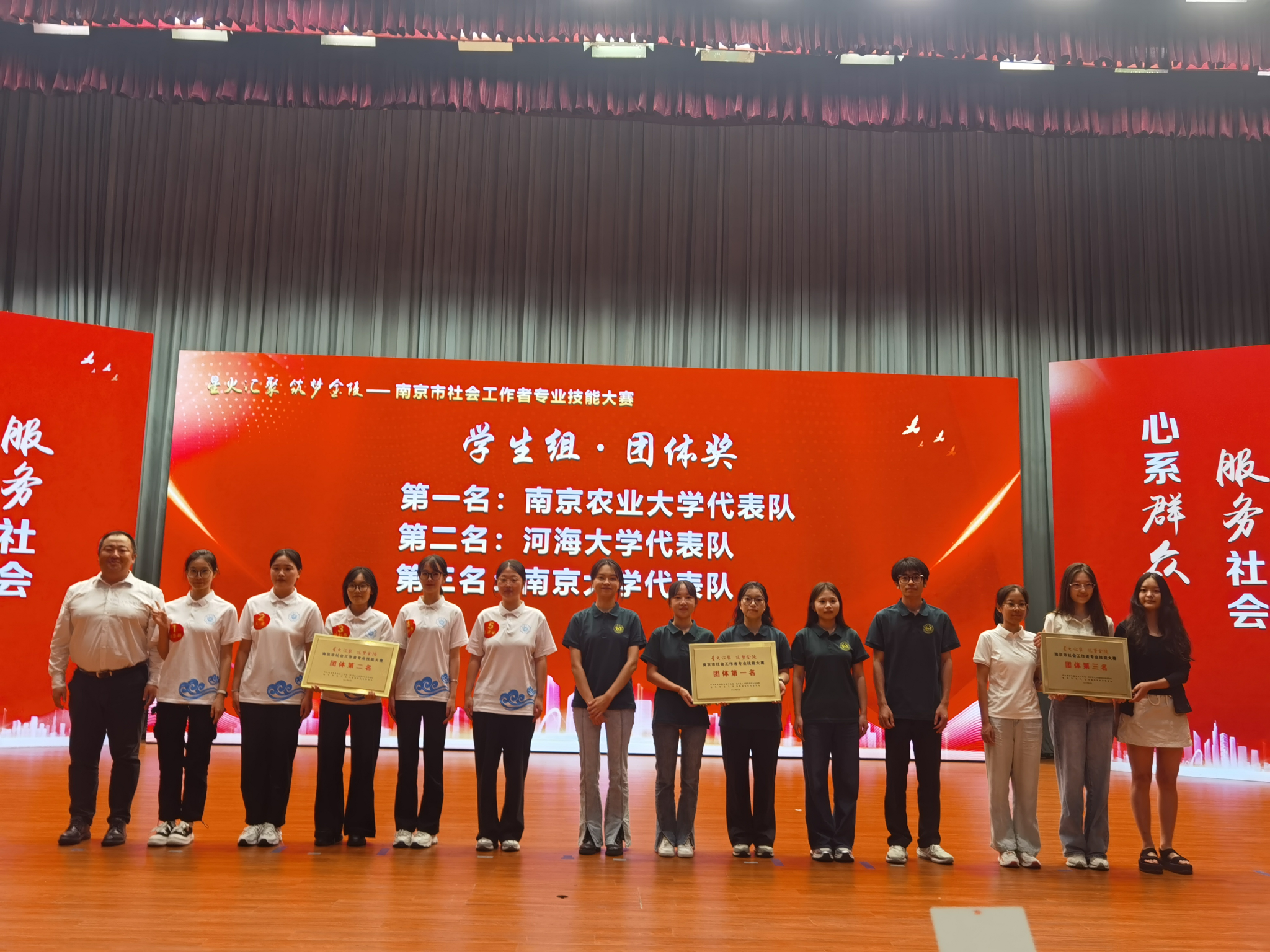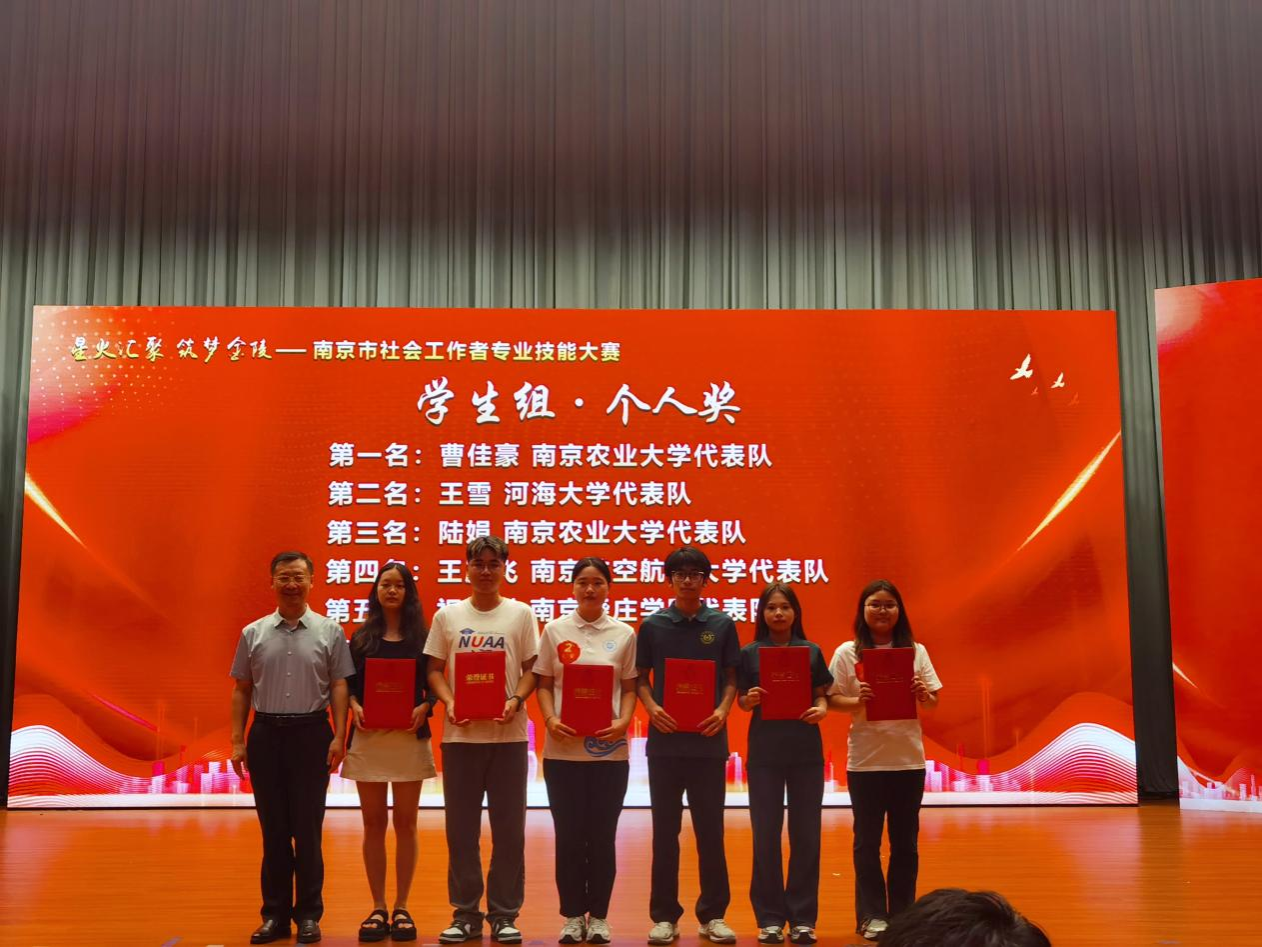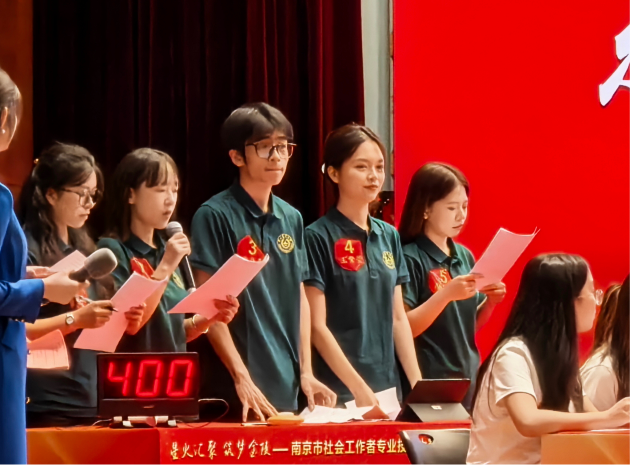 2024级社工研究生曹佳豪、陆娟、王紫萱、刘欣雨、潘明作为选手参赛,20余名社会工作专业硕士研究生到场观摩。朱慧劼老师担任领队,戚晓明教授受邀参加活动。