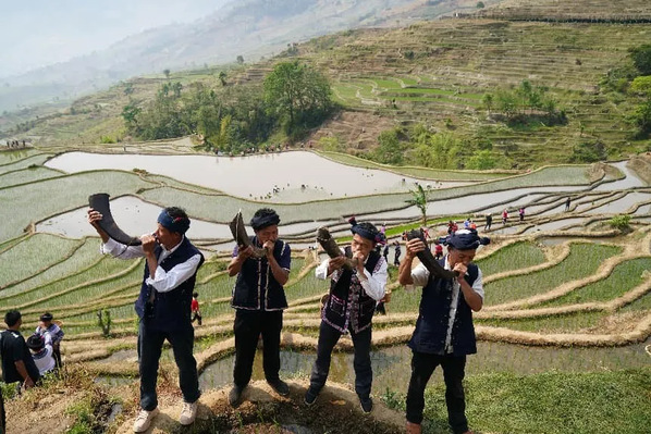 2023年4月22日,云南红河县在撒玛坝万亩梯田举行“开秧门”仪式,这是当地哈尼族村寨迎接播种的传统仪式,标志着春耕生产正式开始。图为哈尼族民众吹响牛角号。中新社记者 刘冉阳 摄