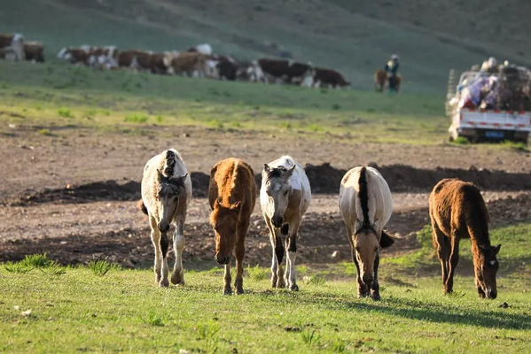 2023年6月16日,内蒙古赤峰市阿鲁科尔沁旗,当日是阿鲁科尔沁游牧系统启幕夏季转场的第一天。图为牲畜在转场途中。中新社发 巴雅尔图 摄