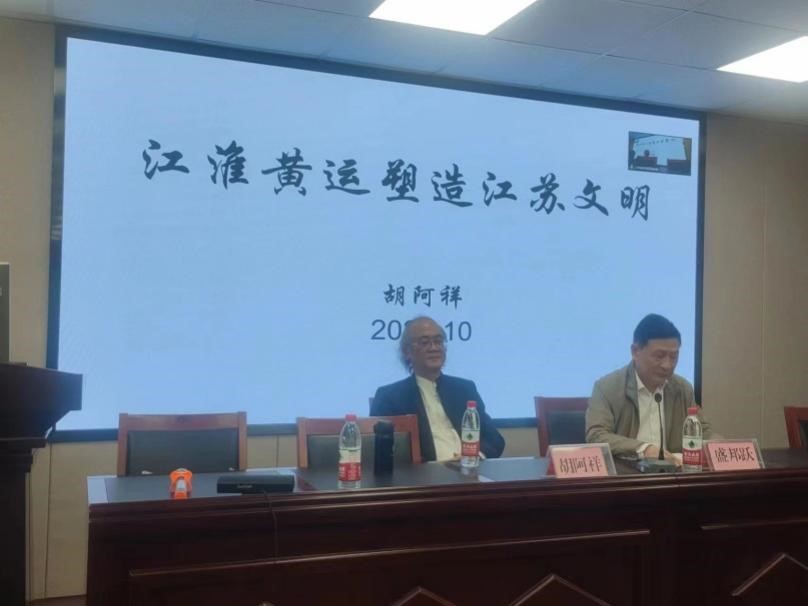 此次讲座中胡阿祥教授首先谈到了河流与文明的关系,河流孕育了文明,文明丰富着河流,而江淮黄运正是解读江苏文明的密码。接着用史料阐述了江淮黄运在历史中的变迁,黄河夺淮,运河逼淮使得江苏地区遭受严重灾害。在传统帝制时期,江、淮、黄、运可拟喻为“母亲河”“隐忍子”“父亲河”“富贵子”。这样的“父母”与“二子”对于江苏文明的塑造有重要作用。随后介绍了江淮黄运对于长江下游地区土地的塑造作用,苏北沿海的滩涂,里下河的垛田,矶头与坍江的形成均与之相关。之后阐述了长江之于南京,犹如长城之于中原的观点。他认为历史上无论是分裂时代还是统一时代,长江都成就了南京的非凡政治地位,也决定了南京传承华夏文明的民族意义。在此基础上,他又指出江淮黄运影响了江苏地区的古今政区分布,形成了金陵文化、吴文化、维扬文化、楚汉文化和海洋文化,并阐释了长江承担文明使命,淮河承担奉献使命,运河承担政治使命的观点。最后胡阿祥教授对本次讲座进行总结,要从历史中看江淮黄运的“恩怨情仇”,吸取经验教训,顺应自然规律,与自然和谐相处。这样的江淮黄运塑造出的江苏文明值得我们致敬、品味、思考。