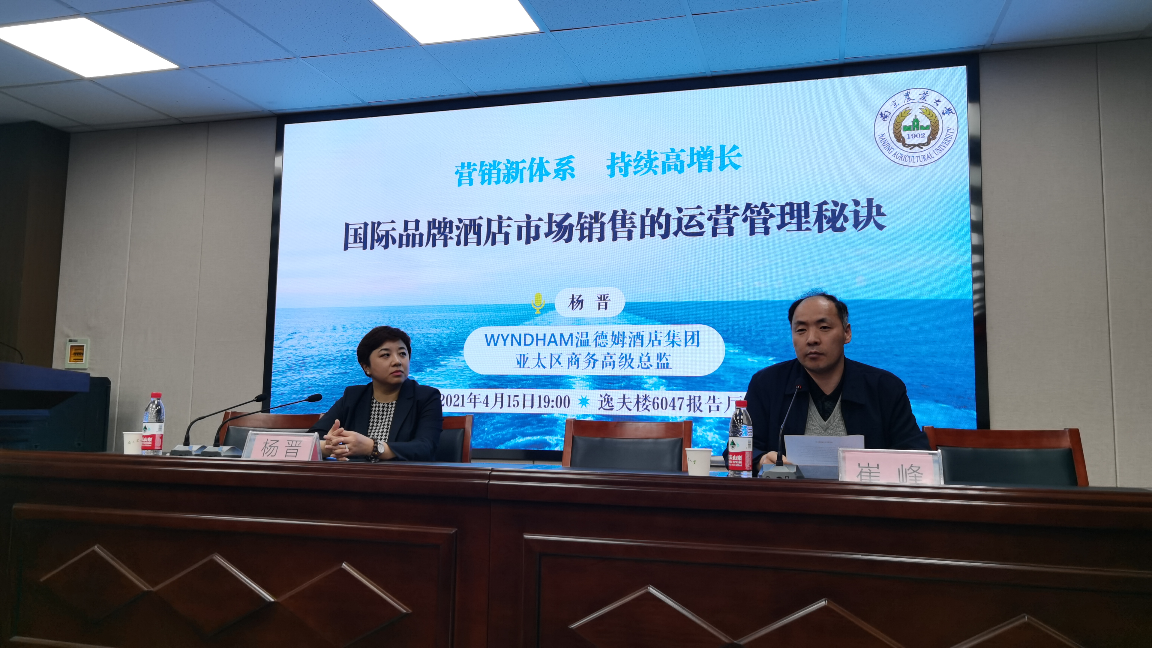 旅游管理系邀请,温德姆酒店集团(WYNDHAM)亚太区商务高级总监、旅游管理专业2000届优秀校友杨晋女士在逸夫楼6047报告厅作了题为“营销新体系,持续高增长——国际品牌酒店市场销售的运营管理秘诀”的学术讲座。旅游管理系主任崔峰教授、黄颖老师、翁李胜老师及旅游管理等相关专业本科生、研究生共60余人参加了讲座。讲座由崔峰主持。