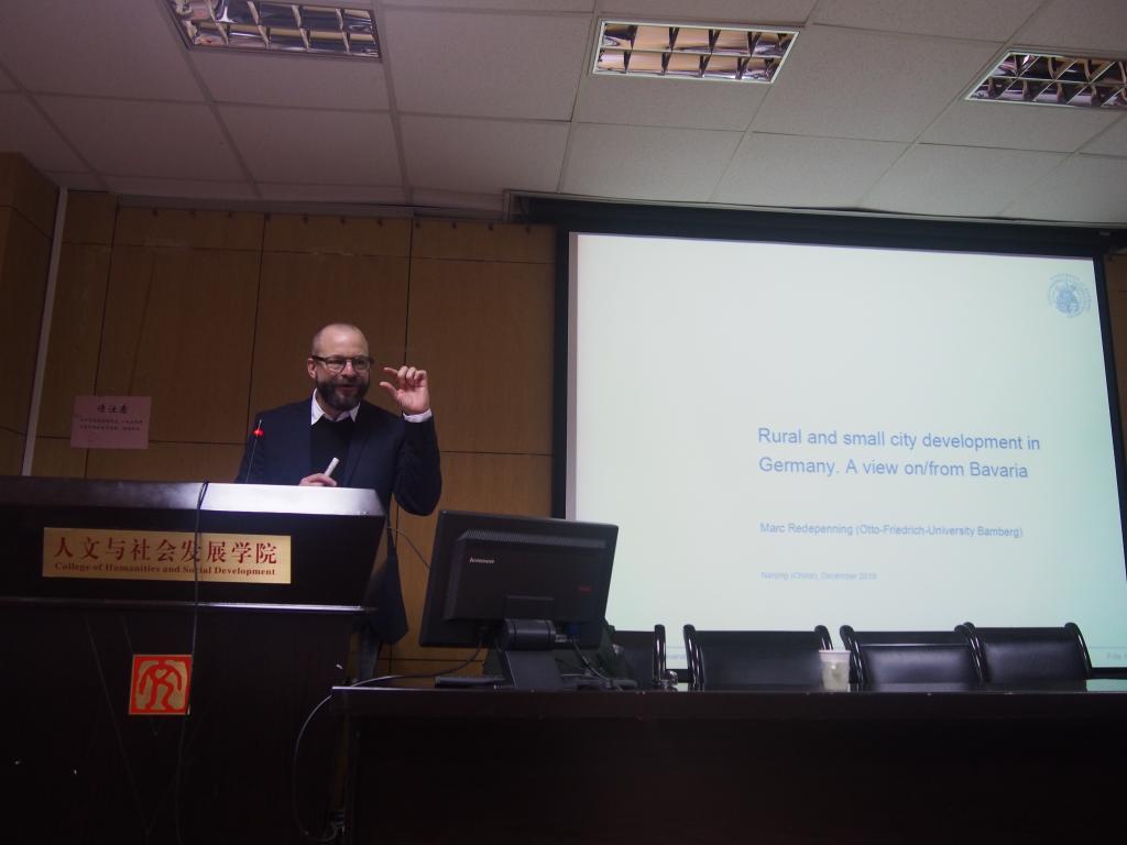 本次讲座主要介绍了德国农村和小城市近期的发展趋势。马克教授分享了德国农村和小城市近期发展的最新数据。利用各类型地理数据及人口地图、城乡分布地图等充分解释目前德国农村面临的问题。马克教授指出,这些数据可以清楚地看出德国近期和未来人口变化所带来的挑战。面对如此的挑战,他还介绍了相应解决方案:那就是要建立一种新型文化,这种文化就是与当地人民合作的文化,改变单一的发展模式,以合作开放的文化面对这些挑战和问题。马克教授提出了地方文化和地方认同的问题,即“反身的”从业者的作用问题。并且针对研究中所使用的的理论和方法论做了说明。