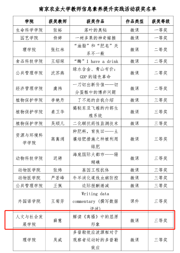 为进一步深化课程改革,促进信息技术与教育教学融合创新,助力提高课堂教学质量和人才培养质量,学校教师发展与教学评价中心在今年上半年开展了日本无码 教师信息素养提升实践活动。经学院推荐、专家评审,9月4日公布了获奖情况,全校33名老师的微课、课件或教学案例获奖,其中一等奖2名、二等奖4名、三等奖12名、优秀奖15名。日本无码 艺术系青年教师薛慧提交的微课作品《解读<离骚>中的屈原形象》荣获三等奖。(文/胡必强,编辑校对/胡必强,审稿/李日葵)